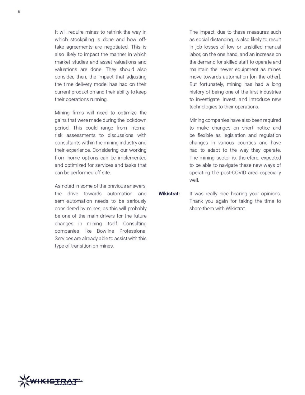 The main opportunities will be for equipment suppliers and service providers, especially on automatization and semi-automatization operations. I think the other big one will be the IT sector, where the work from home [atmosphere] will require more people to be able to access their company infrastructure and to offer remote troubleshooting support for them. There may also be an increase in the numbers of pay-per-use licensed software, such as modeling or drafting packages. -Dr. Nicolaas C. Steenkamp