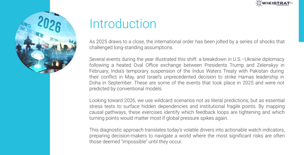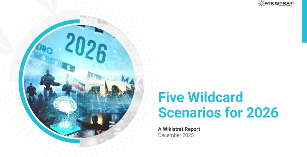 Wildcard scenarios aren't predictions; they're stress tests. The biggest shocks of 2025 were the ones dismissed as impossible until they happened: the Trump-Zelenskyy blowup, Israel striking Hamas in Doha, India suspending the Indus Waters Treaty mid-conflict. For 2026, Wikistrat has mapped five high-impact scenarios, from an IRGC coup to Chinese humanoids on the battlefield to a Rust Belt revolt against automation, tracing the pathways that could turn today's volatility into tomorrow's defining crises